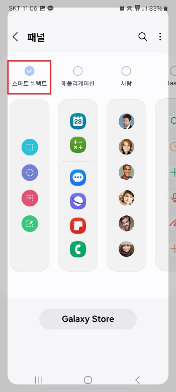 엣지 패널에서 스마트 셀렉트를 선택하고, 다른 기능은 체크 해제합니다.